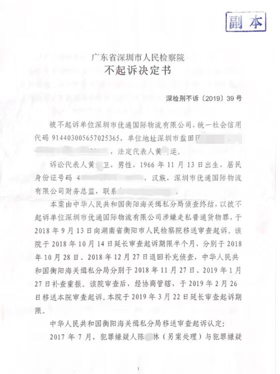 深圳市检察院于2019年4月作出的《不起诉决定书》显示,检方决定对货代公司——深圳优通公司及其老板黄某运作出不起诉,称经退补侦查,该院仍认为衡阳海关缉私分局认定的犯罪事实不清、证据不足,不符合起诉条件。